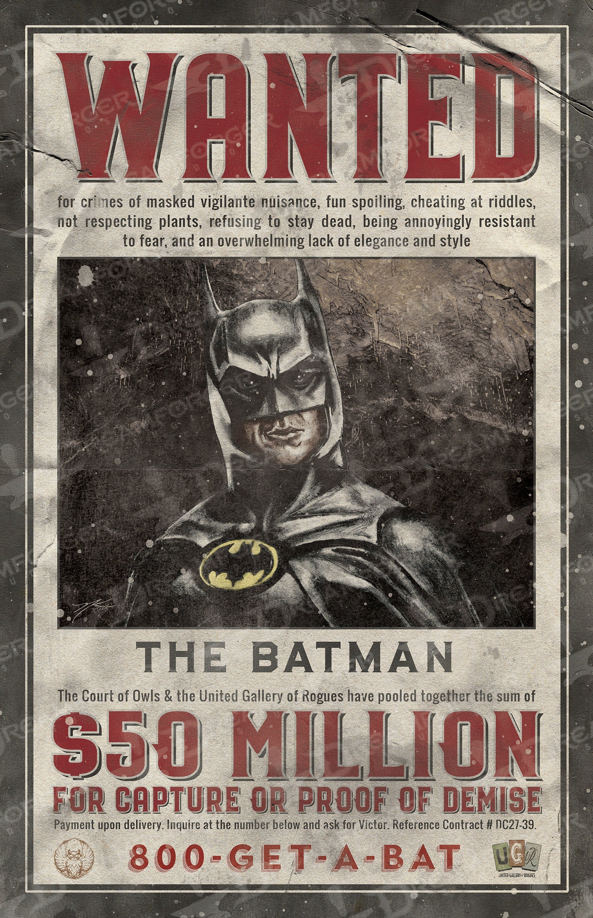 Originally an art piece I did for a local art show, I re-imagined a wanted poster for the Batman Mythos but from the villains perspective. I got the idea from the game Batman Arkham Origins but wanted to do my own take on it - getting the entire Rogue's Gallery in on the fun. I hand drew my favorite version of Batman (Keaton) and then brought into Photoshop for some color tweaking and poster creating!