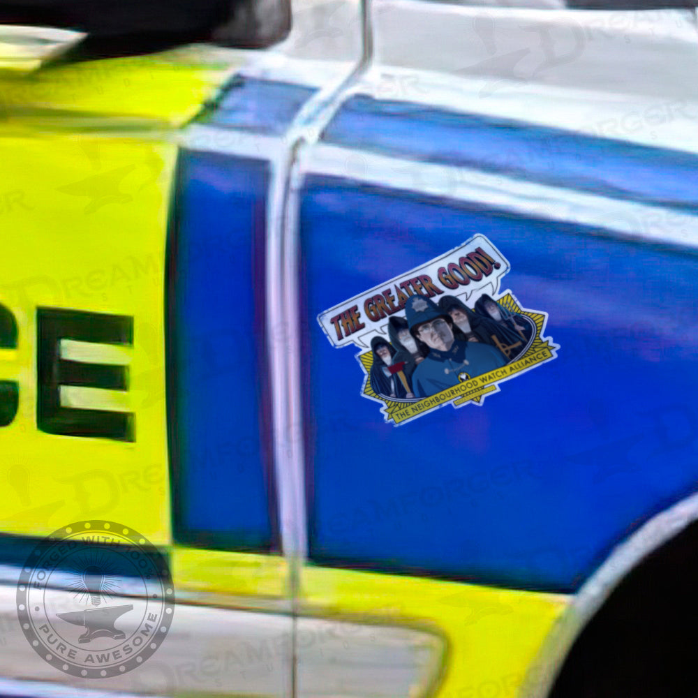 "The Greater Good" is measured at 3.25" x 4.25" on sturdy vinyl material that is durable, UV protected, & waterproof. Keep this sticker close to commemorate your loyalty to the Neighborhood Watch Alliance and help Make Sandford Great Again!